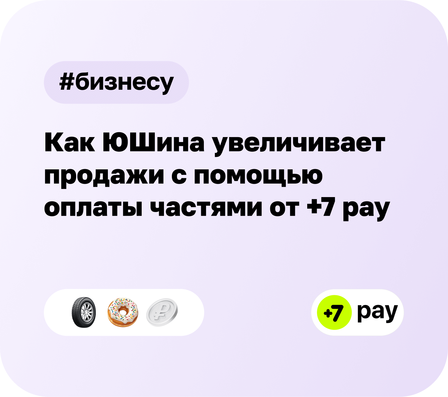 ЮШина — один из крупнейших магазинов шин и дисков, предлагающий продукцию ведущих брендов. Высокая стоимость комплектов может отпугивать клиентов, которые не готовы сразу оплатить всю сумму. Решение — гибкая рассрочка от +7 pay, которая увеличивает конверсию и средний чек без дополнительных финансовых рисков для бизнеса.